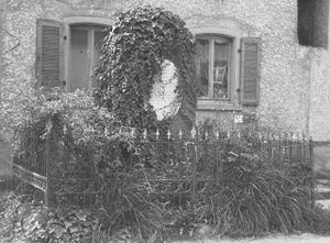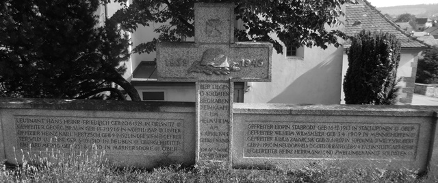 Das Bild zeigt das Denkmal an seinem ursprünglichen Standort. 1930 bis 1932 wurde das Ehrenmal von Bildhauer Walter aus Schmie bei Maulbronn erstellt und neben der Friedenslinde am Weg zur katholischen Kirche aufgestellt. In den Seitenbereichen wurden die Gefallene 1. Weltkriegs eingemeißelt. 1934 wurde das Denkmal neben der evangelischen Kirche neu aufgestellt. Durch die größere Fläche konnte das Denkmal in eine parkartige Anlage integriert werden. Für den Schulhausneubau 1957 musste das Denkmal dann aber wieder weichen. Mit Fertigstellung der Grünanlage am Schulhausvorplatz erhielt das Denkmal dann seinen endgültigen Standort. Im Jubiläumsjahr 1969 wurde auf der Rückseite des Denkmals die Gefallenen und Vermissten des 2. Weltkriegs eingemeißelt. Dabei wurden die betroffenen Männer der Vertriebenenfamilien mit einbezogen. Jedes Jahr zum Totengedenktag veranstaltet die Verwaltung mit den Vereinen eine Gedenkfeier und ehrt die Gefallenen beider Weltkriege mit einer Kranzniederlegung.