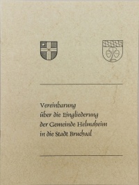 Innerhalb der Gebietsreform Baden Württemberg wurde auch die kleine Gemeinde Helmsheim erfasst. Nach dem gescheiterten Versuch einen Zusammenschluss der Ortschaften zwischen Bretten und Bruchsal zu erreichen, wurden Verhandlungen mit der Stadt Bruchsal aufgenommen. Am 1. Juli 1972 wurden die Bürger der Gemeinde Helmsheim, Bürger der Stadt Bruchsal. Die Gemeinde Helmsheim wurde als Stadtteil mit dem Namen "Stadt Bruchsal, Stadteil Helmsheim" in die Stadt Bruchsal eingegliedert. Standesamt und Grundbuchamt wurden aufgelöst und künftig von der Stadt Bruchsal verwaltet. Das Rathaus wurde als Verwaltungsstelle im Stadtteil Helmsheim eingerichtet. Die Straßennamen mussten in den Stadtteilen vereinheitlicht werden. Dabei blieben die Namen in Reihenfolge des Eingemeindungszeitpunkts erhalten.