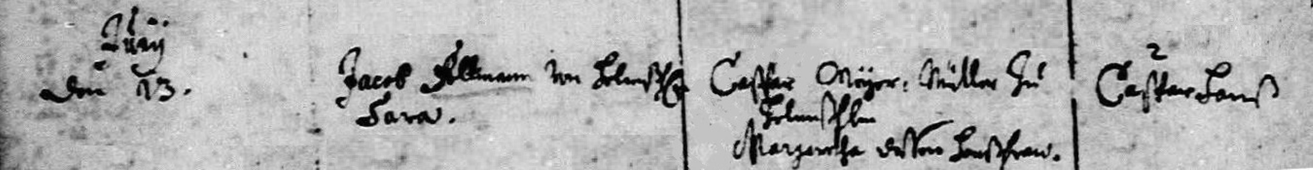 Die erste Erwähnung war 1700 als Jakob Feldmann und seiner Frau Sara ihr Sohn Johann Caspar geboren wurde. Zeugen waren Caspar Mayer, Müller zu Helmsheim und Margarethe seine Hausfrau.