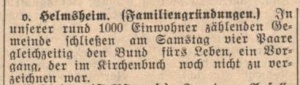 Am Samstag, den 28. Dezember 1935 wurden in Helmsheim vier Paare kirchlich getraut. Dies war für den kleinen Ort Helmsheim schon ein Ereignis, es fand sogar Eingang in das Karlsruher Tagblatt.