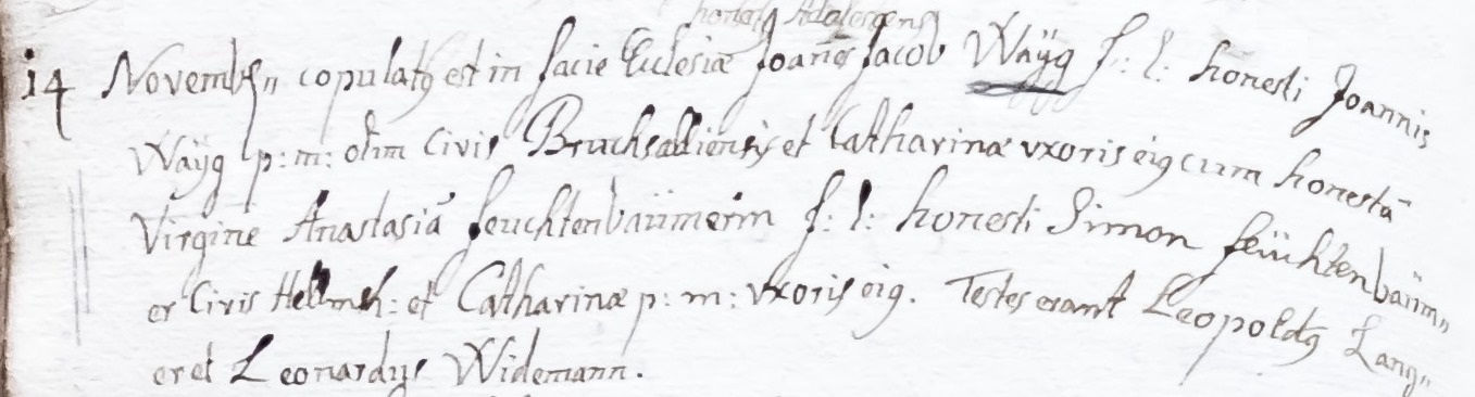 Der erste urkundlich Erwähnung ist Joannes Jacobus Weik aus Bruchsal. Er heiratete 1719 die Helmsheimerin Anastasia Feuchtenbäumer. Zur damaligen Zeit wurden die Namen frei nach der Aussprache eingetragen. So entstand der Name Waÿg oder in Bruchsal der Name Weick. Die Helmsheimer Nachkommen verwenden den Namen Weik.